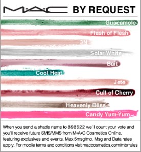For anyone that’s religiously worn M.A.C. Cosmetics in the last ten years shall hurry to the company’s Facebook page (or on Twitter, type #MACBYREQUEST) and vote for the selected shades of eye shadow, lip glass, and lipstick chosen for their upcoming July collection MAC By Request, a very special culmination of fans (including celebrities like Kelly Osborne’s) most beloved colors that were previously discontinued. If your anti-Facebook (which is a trend in itself), you can also text your pick (via 898622) by cell phone to M.A.C. by voting once a day for the same shade or eventually all 18 shades. Ranging from pale shimmers to vibrant teals, ”Cult of Cherry” and “Candy Yum Yum” have been some of the most begged for products to return for obsessive beauty routines complimented by M.A.C. items.