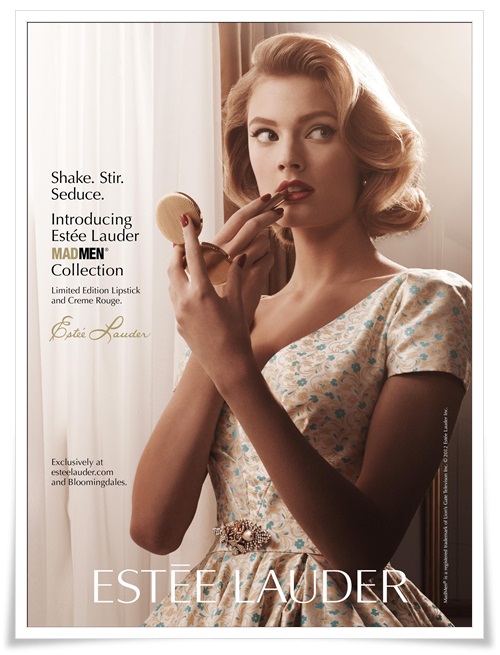 The mini set is inspired by the 1960s beauty statements of the middle to higher class echeleon of women (as seen on the hit AMC show). An accostumed raspberry red lipstick (“Cherry”) and not blush but salmon pink cream rouge(“Evening Rose”) packaged in Lauder’s regular gold vintage-looking compacts and tubes.