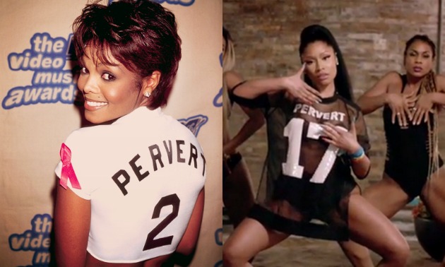 20 years later in the “Feeling Myself” video (that looks like a sequel to Beyonce‘s “Party” visuals), in her dance scenes with two background dancers, Minaj wears a see-through jersey that reads ‘Pervert’ on top. It’s also numbered like Janet’s tee, except it says “17”, not “2.” Fashion Bomb Daily discovered that Minaj’s jersey is by Givenchy and costs over $1,000.