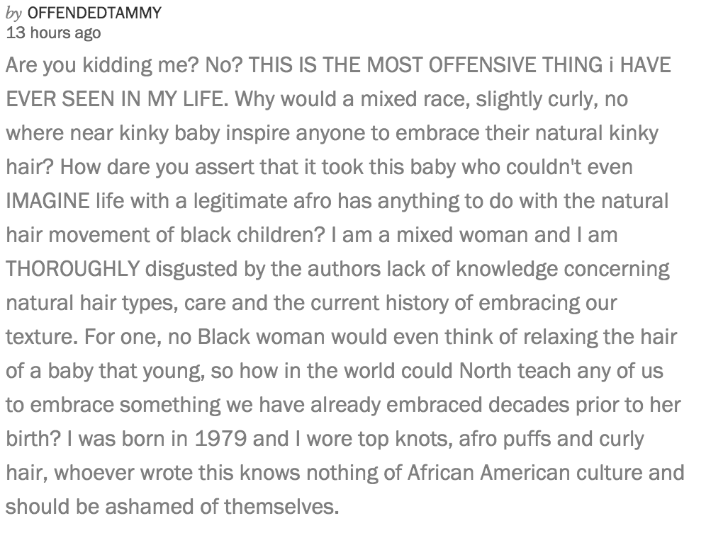 What could have been a super cute article about North West as the new kiddie representative of U.S.’s increasingly multicultural and multiracial population was condescending to the one community that will have West’s back when she is reminded that she is Black in America: Black women and women of color.