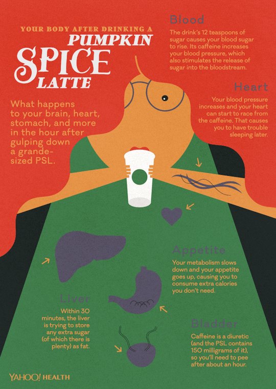 It also stated that within 20 minutes of devouring that delicious PSL (Starbucks also announced that this year would be the first to include “real” pumpkin. Like when KFC or McDonald’s declared they were going to start using “real” chicken) your pancreas reacts like a gerbil on a wheel, kickstarting other high-strung aftereffects the body has to pumpkin spice. (But there are 14 grams of protein!)