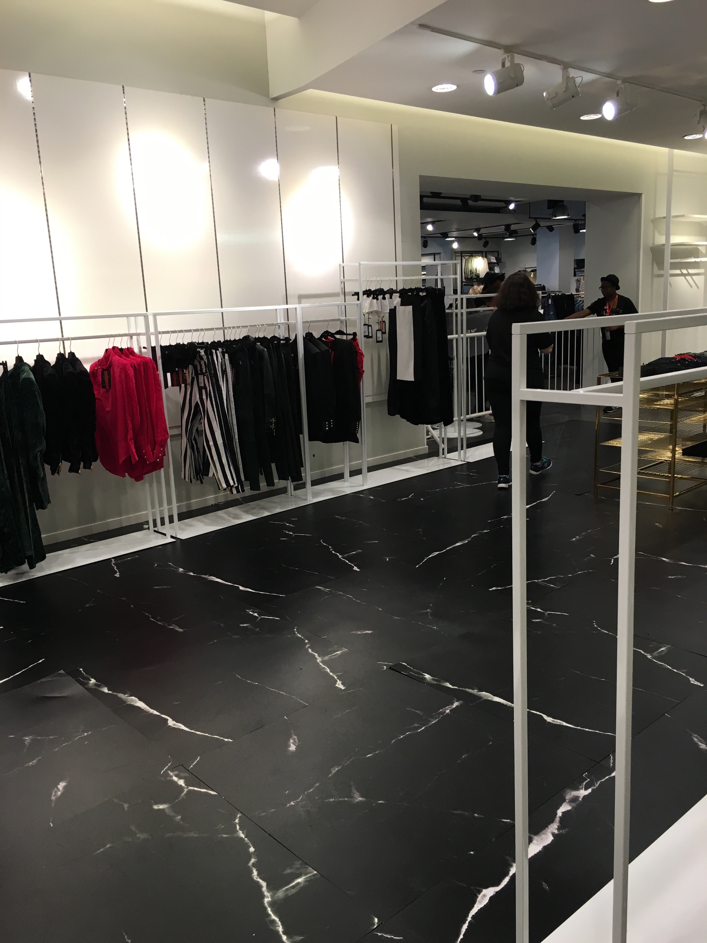 I was the first in line and I power walked up the escalator to the smaller than we hoped for section of Balmain x H&M. They can’t be serious. Where’s all the cute shit?! Where’s the men stuff I wanted?! My Balmain logo sweatshirt! Mah womenswear furry jacket with the leather tie! The men’s black jumpsuit. That’s that bullshit. A lot of people were just buying shit to resell on eBay. (And H&M website had already been crashing off and on). As expected, I transformed like the rest and began grabbing shit such as a black and white striped blouse, the last red drapey skirt, two of the velvet and silk mock turtleneck tops. A black and white colorblock sweater. I was desperate for the navy top Jourdan Dunn wore but didn’t see it except for the display. *my chest*