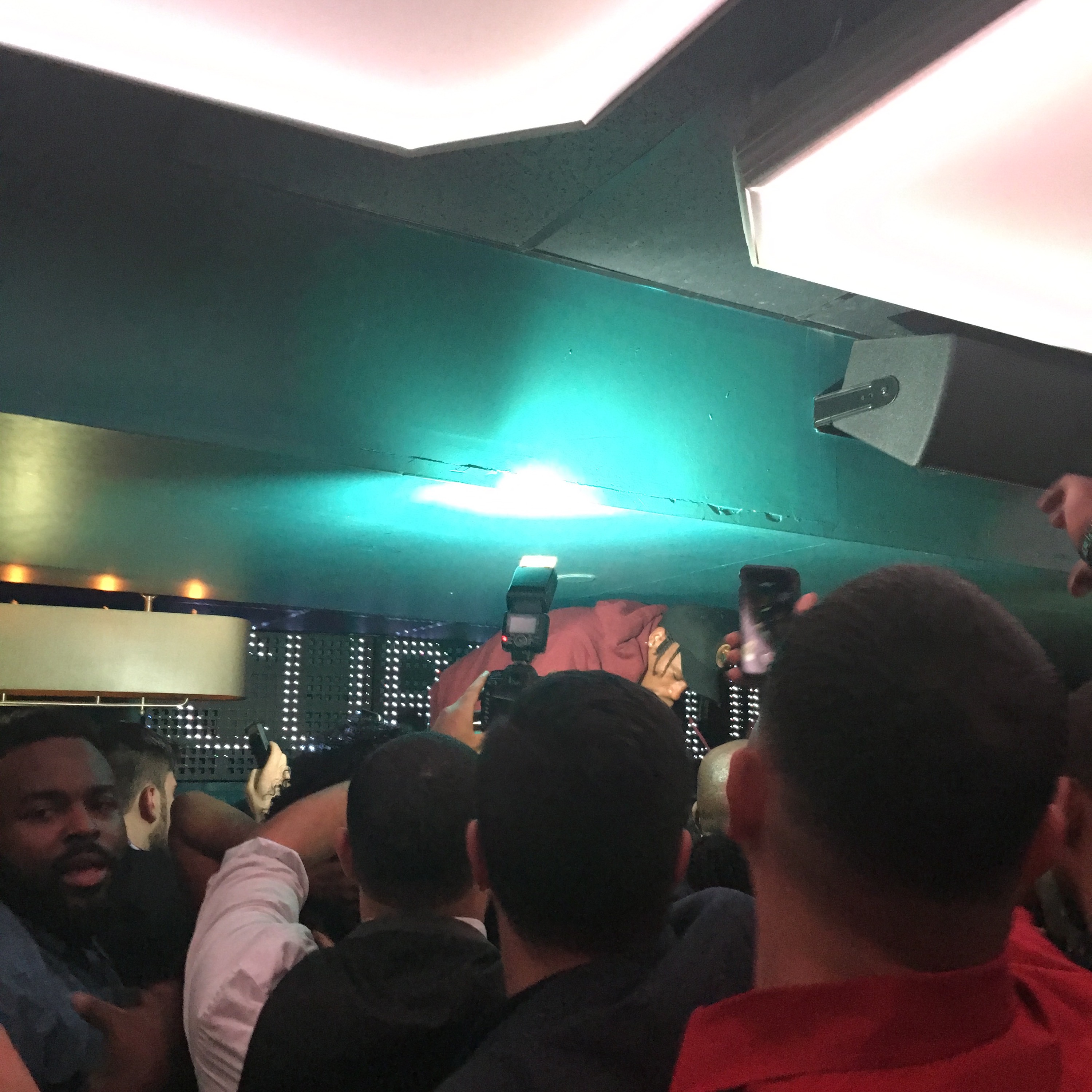 A day after he performed as a part of The Weeknd’s ensemble Madness Tour, in Worcester, MA, Travis Scott made a special club appearance at CURE Lounge in Boston. Despite the hell of a lot smaller space, which included him literally kneeling next to the DJ booth and his head touching the ceiling, he brought his “I wanna rage” to a mixed room of stilettos, sneakers, bodycon skirts and t-shirts.