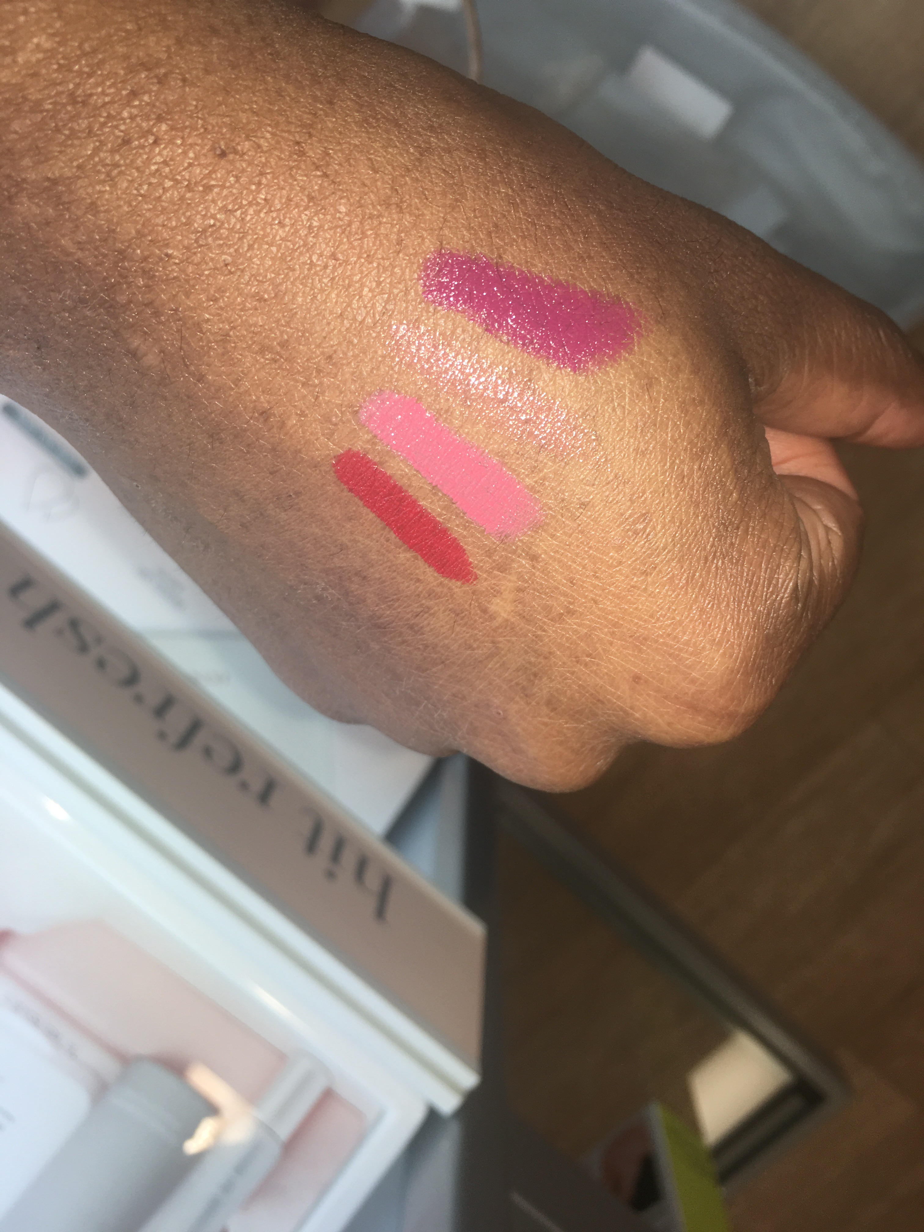 On the left side of the long display, were the skincare-like items, such as the Tinted Moisturizer, Primer, and Magic Balm. I mixed two of the Tinted Moisturizers together, Cinnamon and Cognac, the brownest-based hues. They felt nice but I don’t think will work for me.