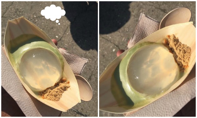 The asking price was $8 and there were two options: Green Tea and brown sugar. While waiting, I overheard the cashier tell a customer ahead to swirl a bit of the liquid that comes with it. When it was my turn, I asked the cashier which would be best to try if you never had the Raindrop. She recommended “Green Tea.” I gave my $8 and in minutes, had a Raindrop Cake in a small light beige tray. And there it was looking exactly what many said online: a blob. A breast implant.