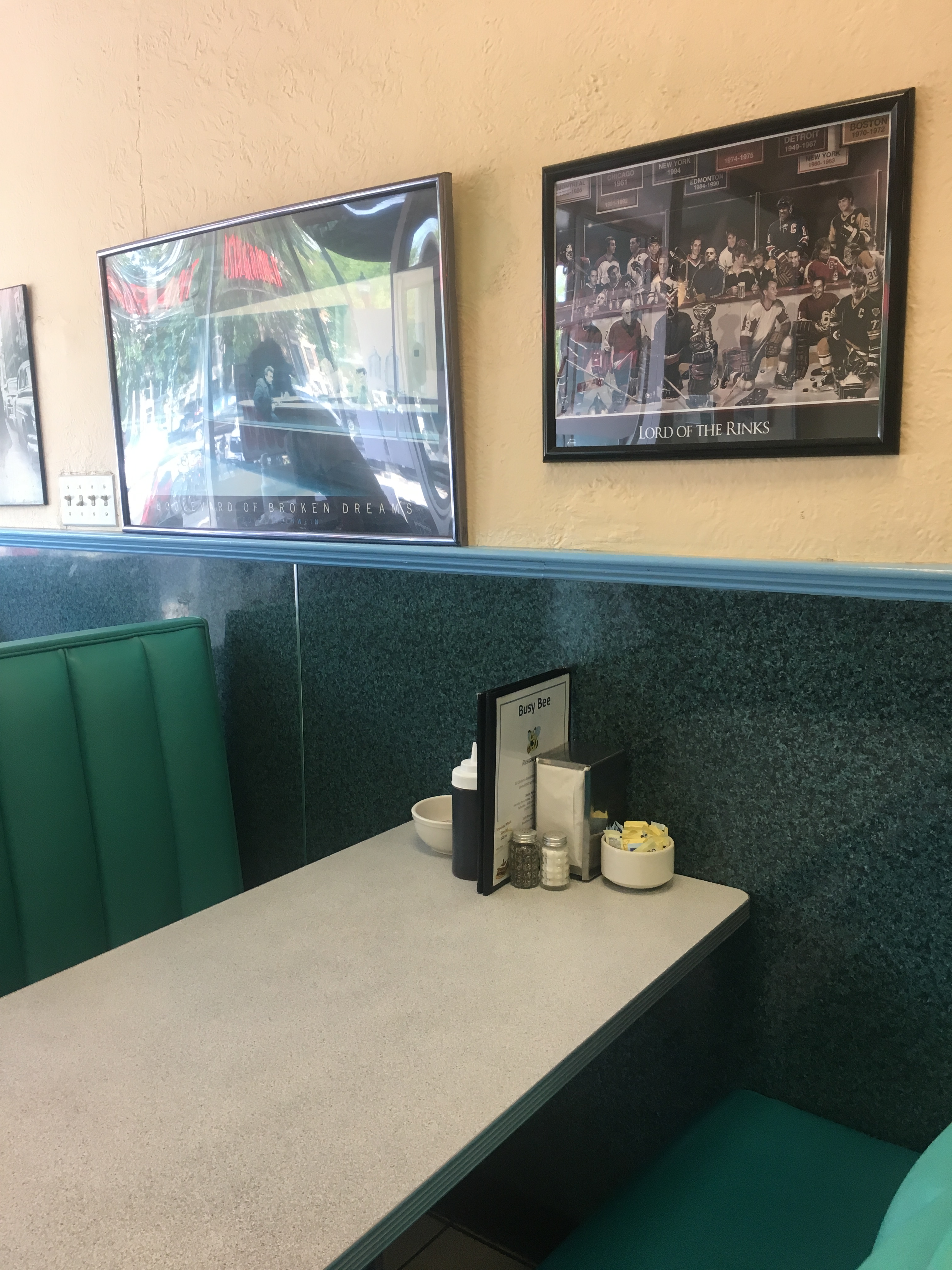 For a diner fix, and someplace different, I finally went to the Busy Bee this week. The outside as familiar as ever, the lettering is simple and plain, spelling out the name. Inside, as I slowly took a stool chair right at the counter, I was pleasingly taken aback by the vivid choice of turquoise in the diner. The cushioned backs of the booths and top of the swivel chairs carried the color well and overall the Bee was very bright. (Nevermind the lightning in my photos!) Its set-up was a standard diner and the colors gave a modern vibe that felt almost ’60s.
