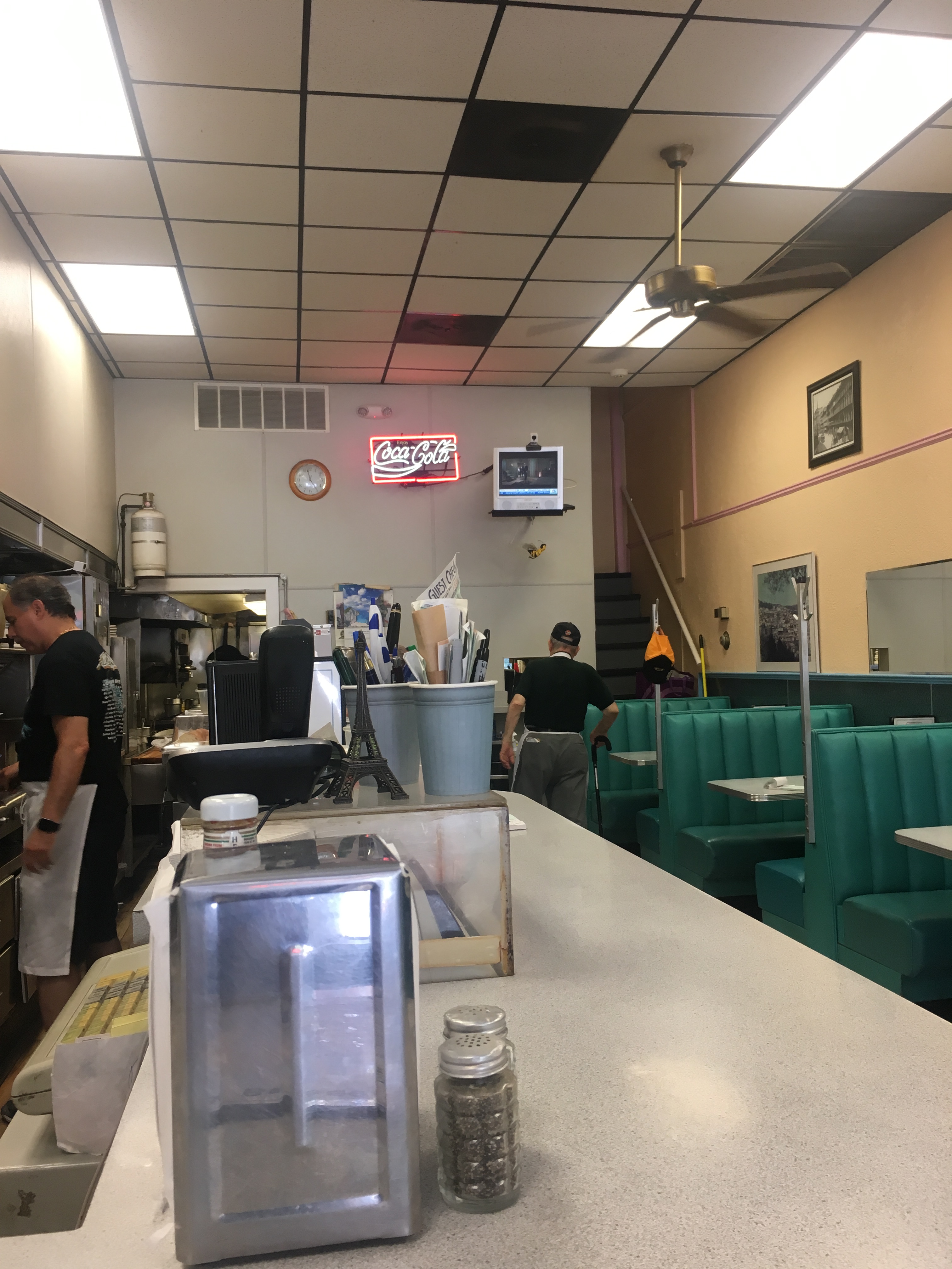 I was greeted with a low “Hello” from a guy behind the counter in a 40th Anniversary Tour t-shirt for the band Boston. He took the menu held up by the napkin tallfold dispenser and gave it to me. I looked but had already decided to get pancakes and bacon, my definite go-to when not craving chicken fingers and fries from restaurants centered on classic American dishes. I watched the Boston band guy make the pancakes in front of me, and when the plates gently swerved my way and he had filled a glass of water, more patrons came in. With the exception of my presence, it seemed to be a regular for everyone else. You could say the atmosphere was Cheers-like, just lighter on the camaraderie as far as we were all more subdued than the hyper characters of the Boston-based show. One young adult male came in just looking for a Coke in a movie-theater sized large, which I thought was unique. He could’ve gone to a nearby convenience store. I was also surprised to see an elderly eat actual liver and onions as an episode of Nickelodeon’s Doug had haunted me about the possible ick factor of the duo.