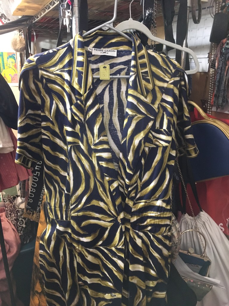 Space was limited, so I made sure my things were in plain view, and I tried on the dress after taking off my DVF blazer. Another good fit and comfy. And Pierre Cardin! 30 Euros wasn’t bad either. So in total, I paid 40 Euros and got 10 Euros back since I paid with 50 Euros. I was pleased and really excited about Cardin. Back in late 2019, I had visited Pierre Cardin: Future Fashion, a retrospective of his innovation in fashion and foray into interior design and licensing, at the Brooklyn Museum. It was great and my mom had a few of his pieces when I was a kid. In Boston, during a vintage fair, this one vendor had Cardin shorts, but they were a little too small for me!