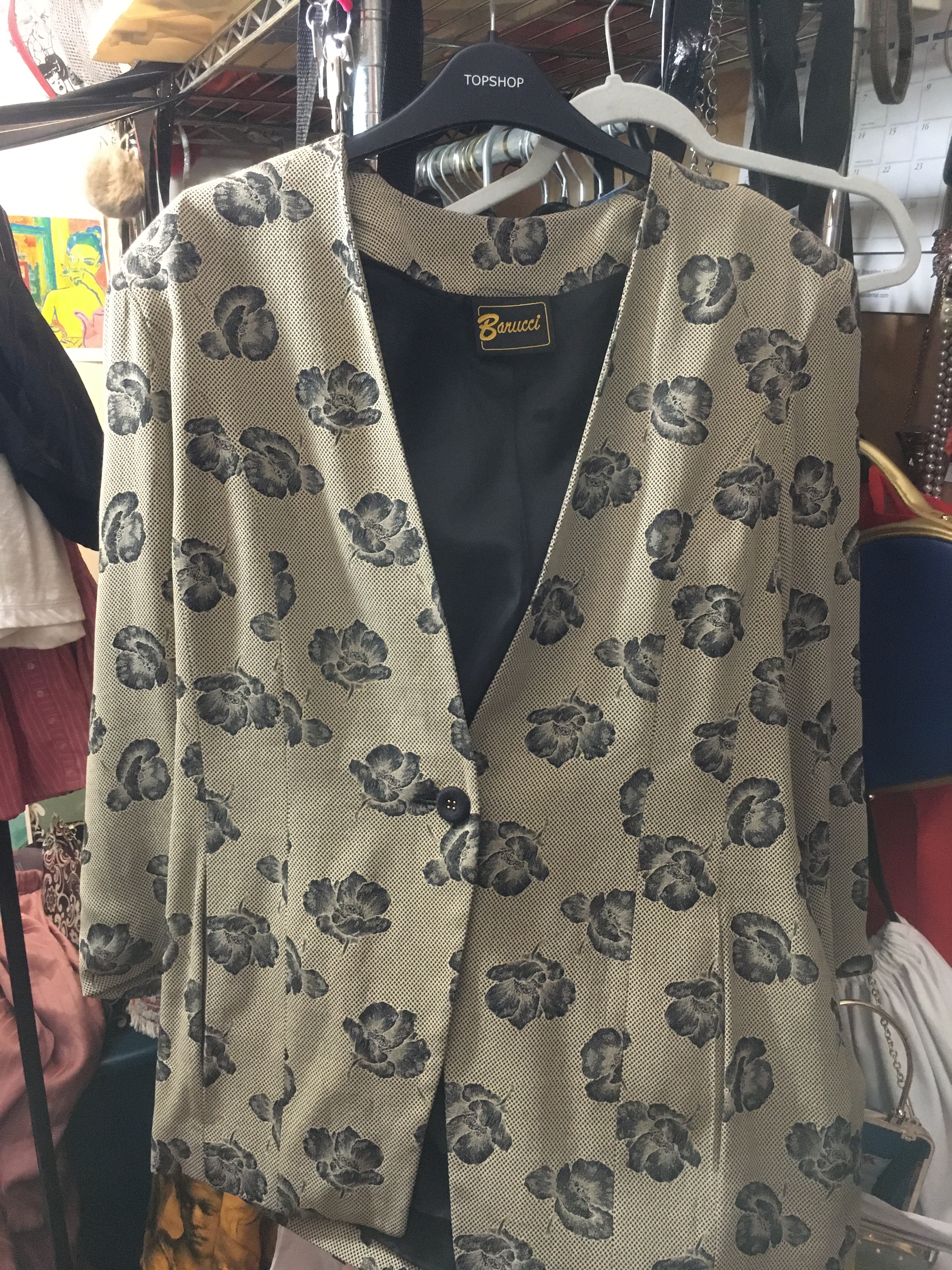 The first item I found was a Barucci blazer! A classic blazer in that it’s a darkened beige with greyish-black flowers all over. It has a pocket on each side and one button. I tried it on and loved it. A good fit and for 10 Euros. So like $12 USD.