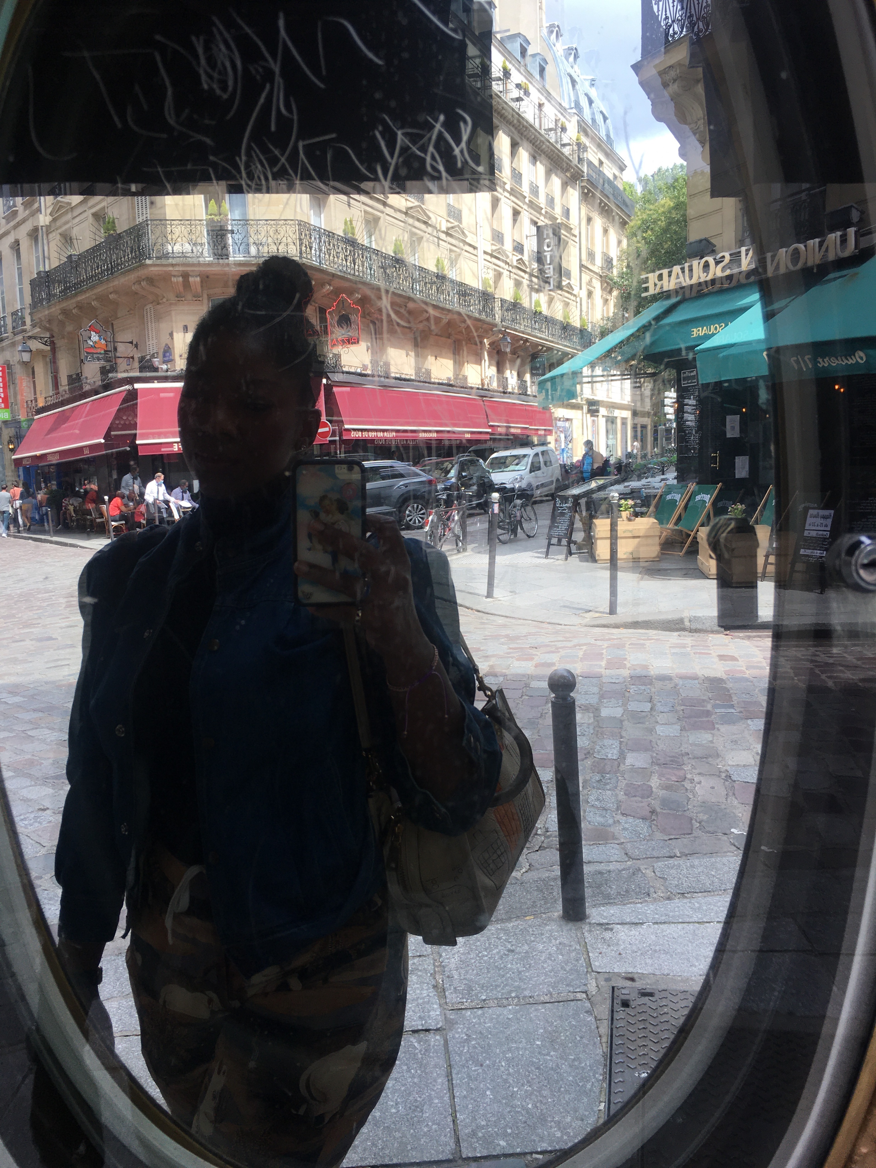 And I know this post is getting long, so let me hurry along! A few more things to share. After buying a denim shirt with the amazing embroidery of a black woman on the back at a kitschy shop, I aimed for 59 Rivoli, an artist hub where they can rent out spaces and showcase and sell art. It looked super cool online and was recommended by both Atlas Obscura and Fodor’s Travel. I made sure to peruse every floor, and on one, I walked through a stunningly and purposely messy life-size diorama. And I believe it was the floor above it that Aranxa Ortega complimented my shorts from Opening Ceremony. While said in French, I knew she had said something nice, but I disclosed and apologized for not understanding French (beyond “Merci,” “Madame”). She let out a quick laugh and rephrased what she said in English! (She speaks Spanish, English, French, and I believe the fourth language may be Portuguese. Her ties to the States is Texas and she’s been in France for the last five years). We got to chatting a bit and she offered to draw my portrait for 15 Euros. I thought why not, and she excitedly gathered her supplies and asked me to find a spot to stare at and to stay as still as possible for ten to fifteen minutes.