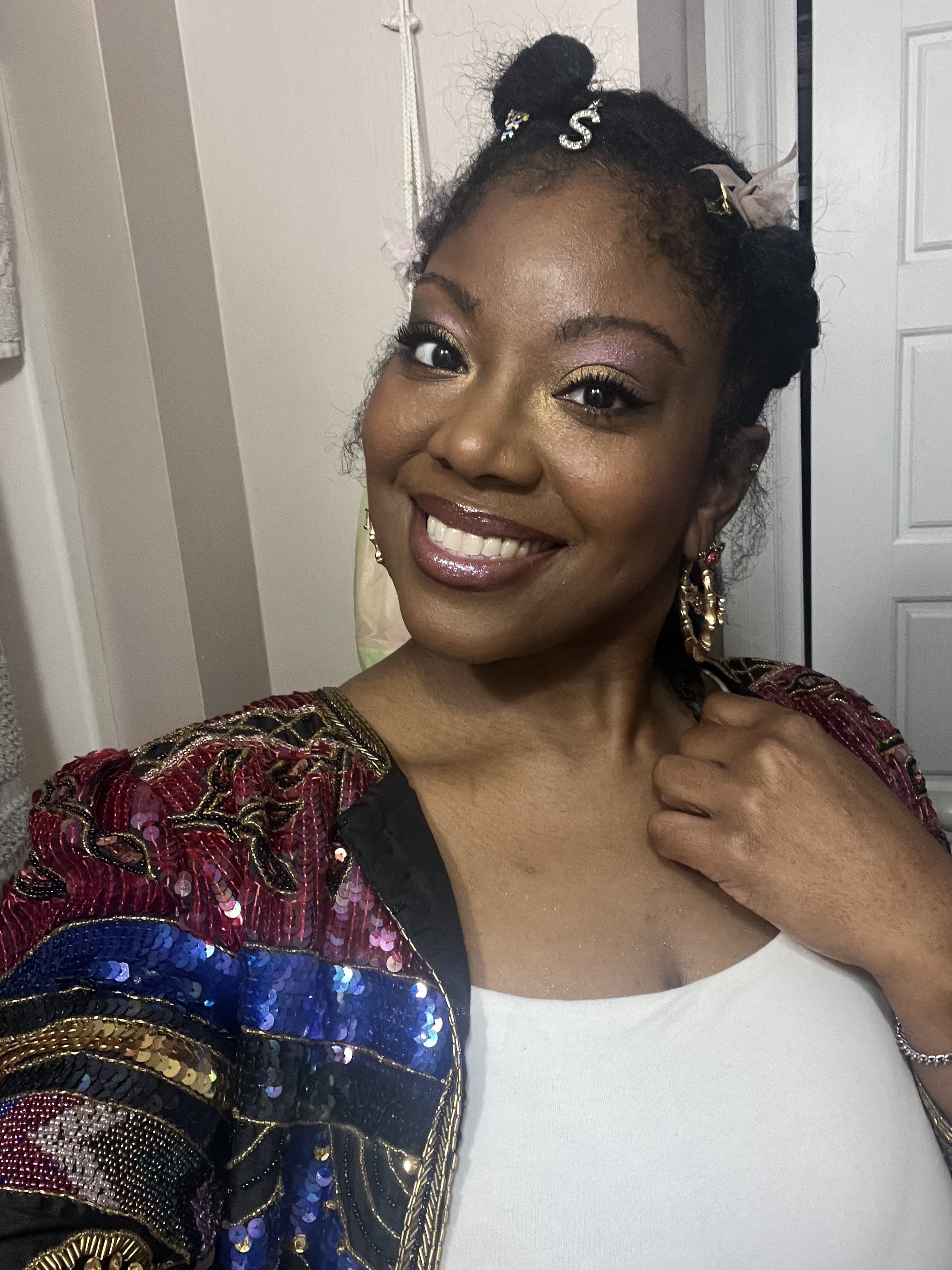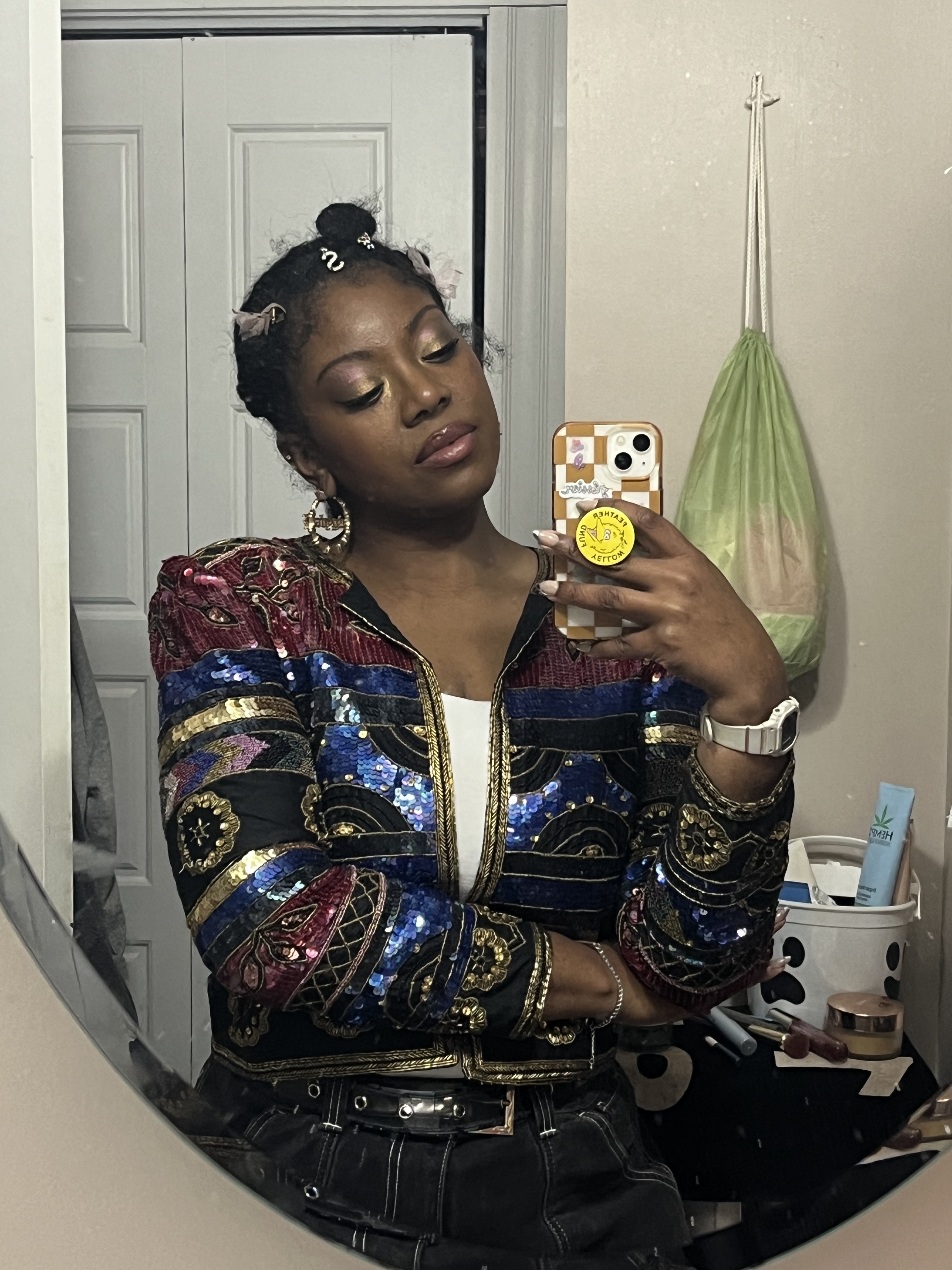 I put some pins in my hair because why not and wore a vintage bedazzled jacket (bolero?) I’ve had for years.